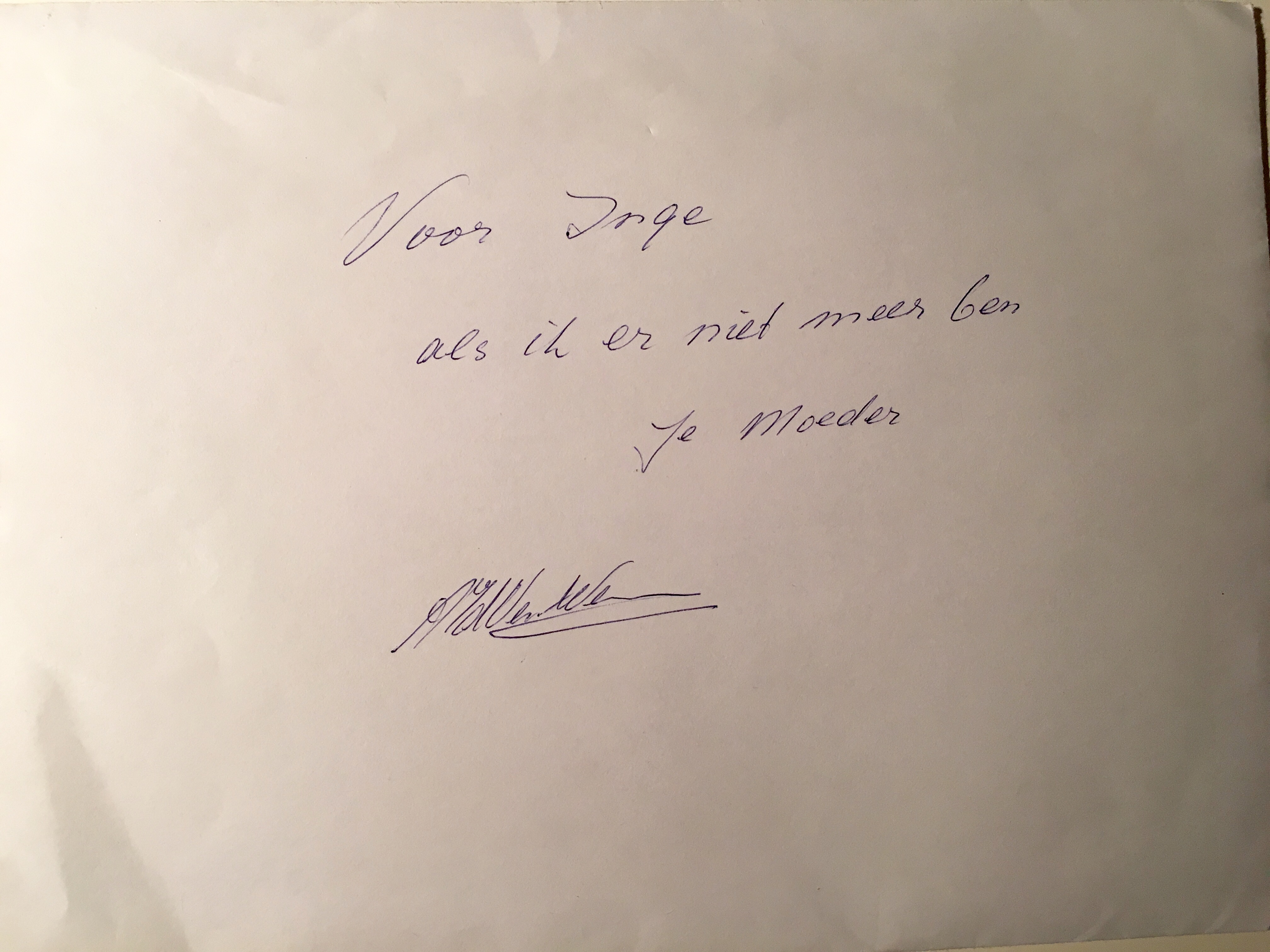 Ik kwam de brief tegen toen ik mijn moeder verhuisde van haar appartement naar het verzorgingshuis. Toen had de dementie haar al zo in haar greep dat ik er niet meer met haar over kon praten; over de brief beginnen zou haar in verwarring gebracht hebben. Ik legde de brief destijds ongelezen op een veilige plaats in mijn huis.